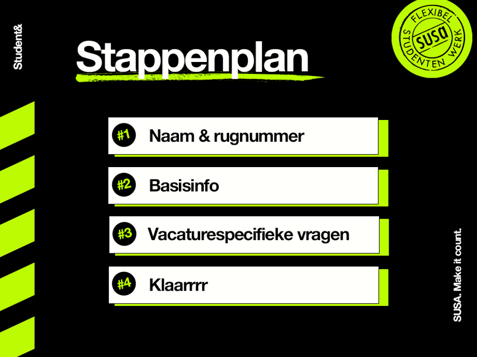 En zo is solliciteren 2.0 geboren: eenvoudig, snel én online. Niet eens heel anders dan je van ons gewend bent. Gewoon via onze website, maar met nét wat andere stappen. De telefonische screening op de belangrijkste eisen van de vacature vindt niet meer telefonisch, maar online plaats. Deze geeft de student namelijk zelf al tijdens het solliciteren mee, in nog geen 3 minuten. Zo kan ons systeem direct registreren of er een match is tussen de wensen van de kandidaat en de eisen van de specifieke vacature.